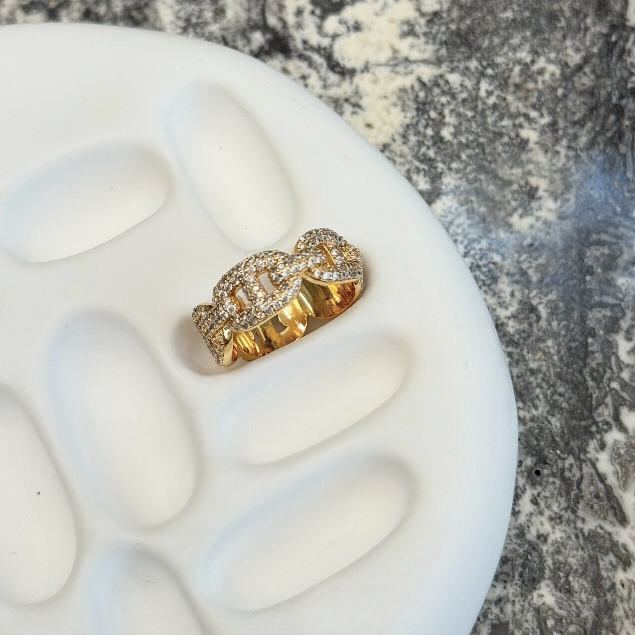18k gold plated chain ring paved with clear cubic zirconia available in three sizes.