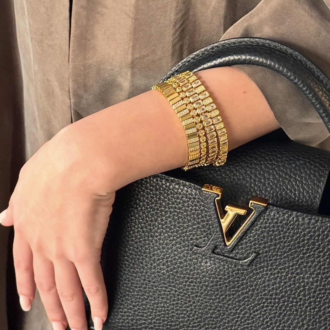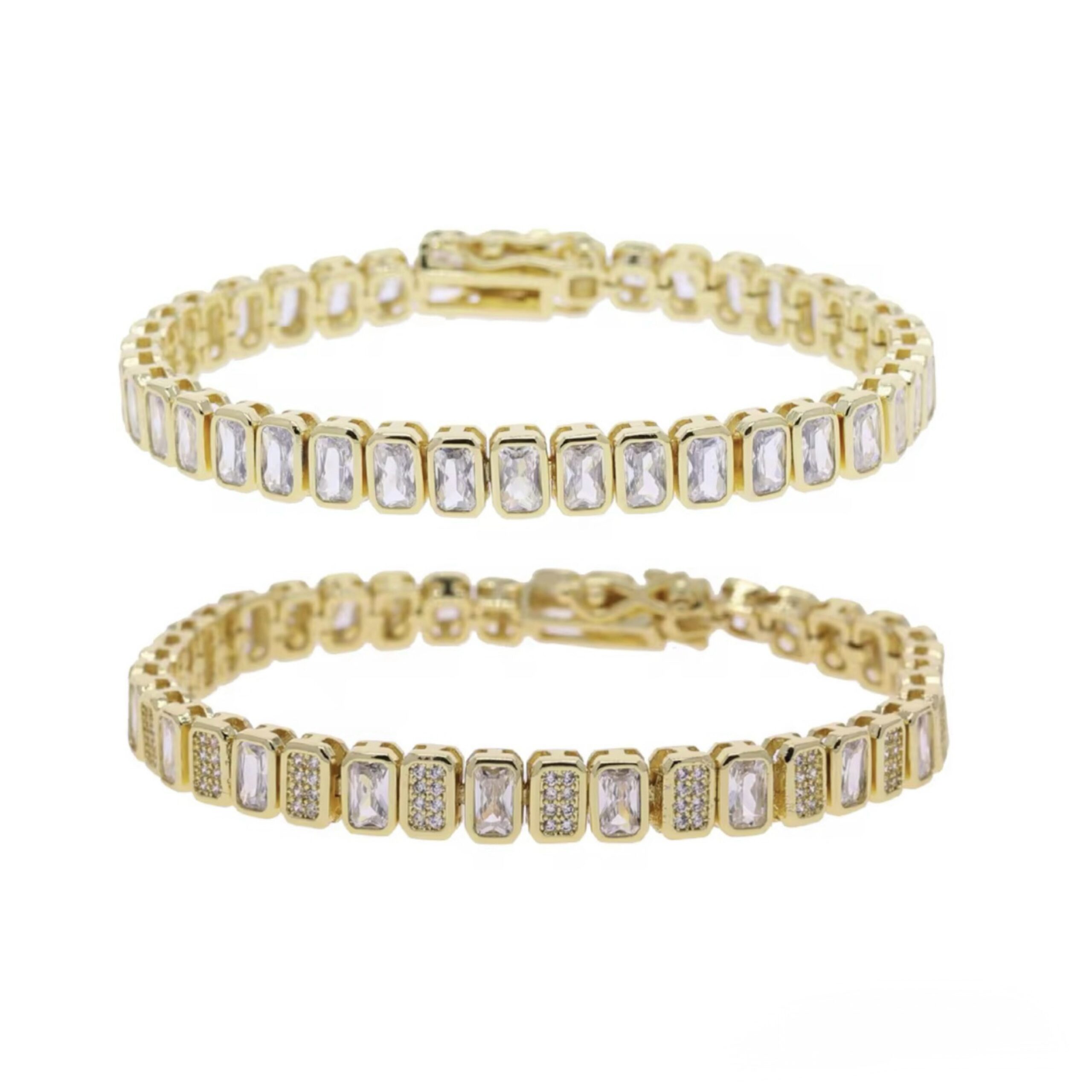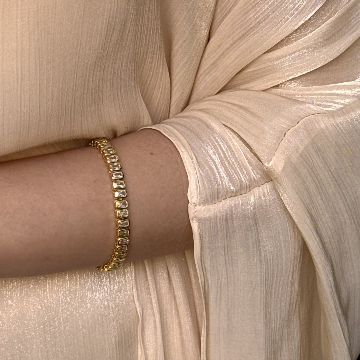 Luxury 18k gold plated bracelet paved with emerald-cut clear cubic zirconia stones.