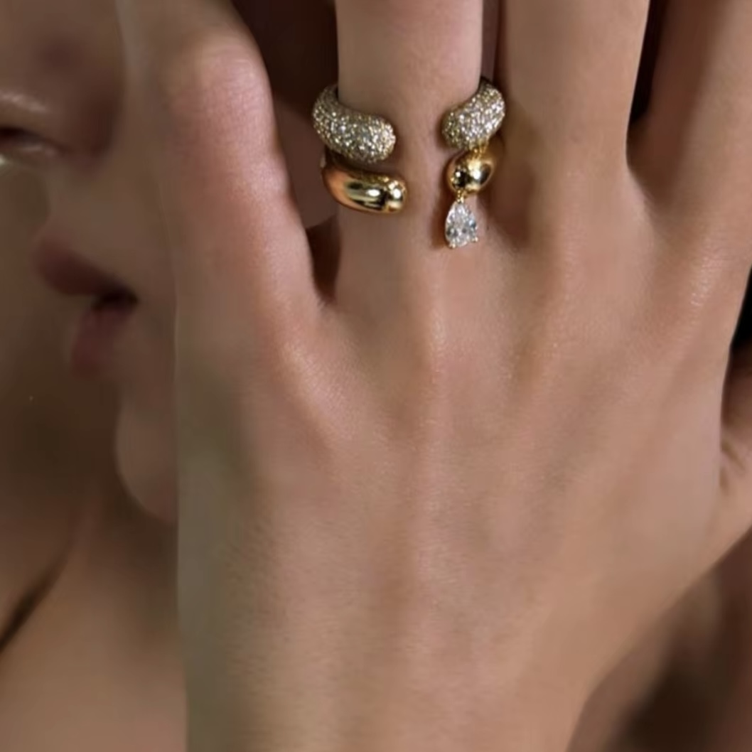 18k gold plated set of two open rings, one ring is paved with clear cubic zirconia while the other sparkles with a floating pear zirconia stone.